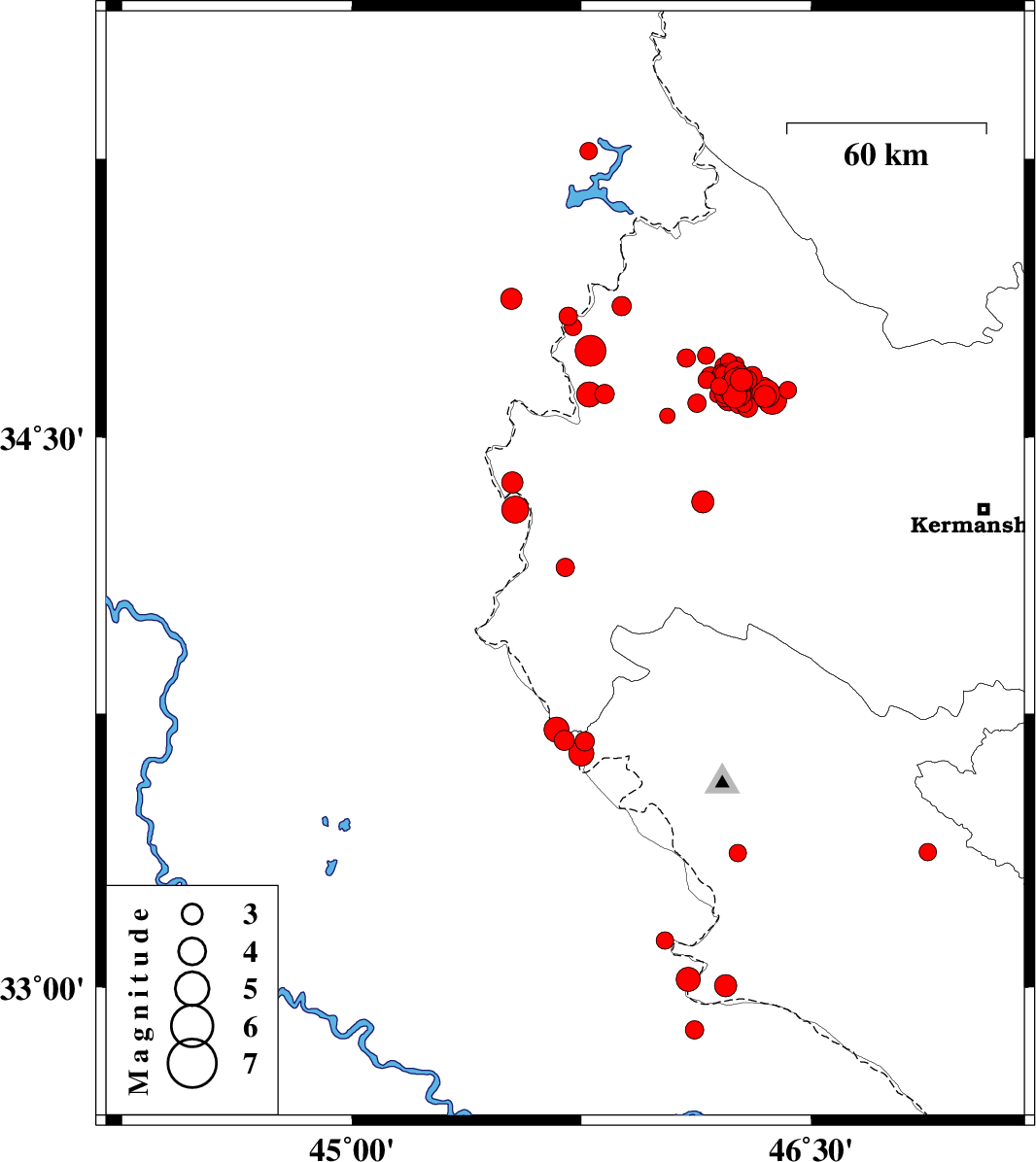 | 2018/07/22 | 10:07:25.9 | 14:37:25.9 | 34.625 | 46.293 | 6 | ML5.6 | Kermanshah Province, 27 km South-West of Javanrud | ||