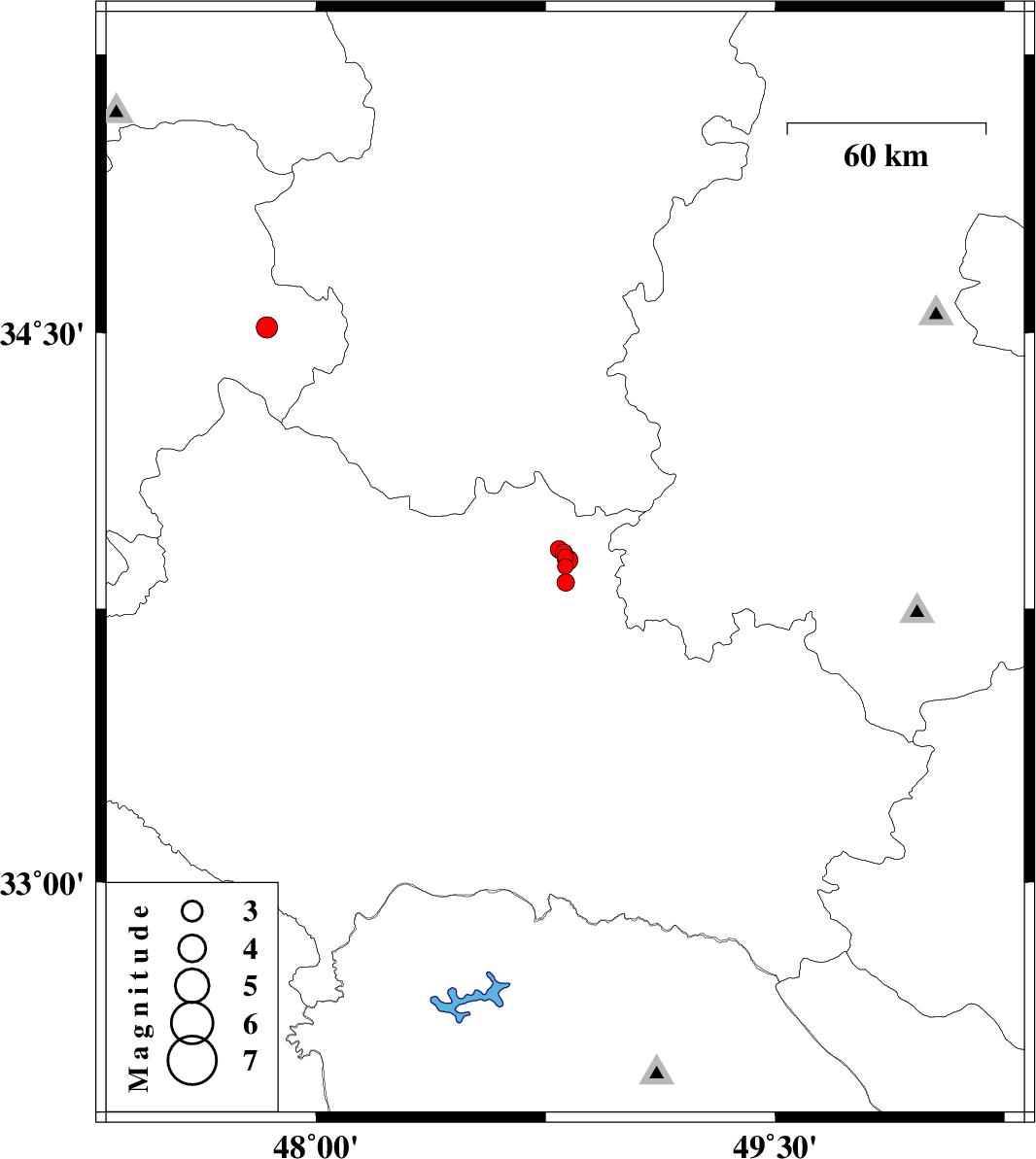 | 2018/08/19 | 05:30:57.2 | 10:00:57.2 | 33.822 | 48.816 | 14 | ML2.6 | Lorestan Province, 10 km of Borujerd | ||