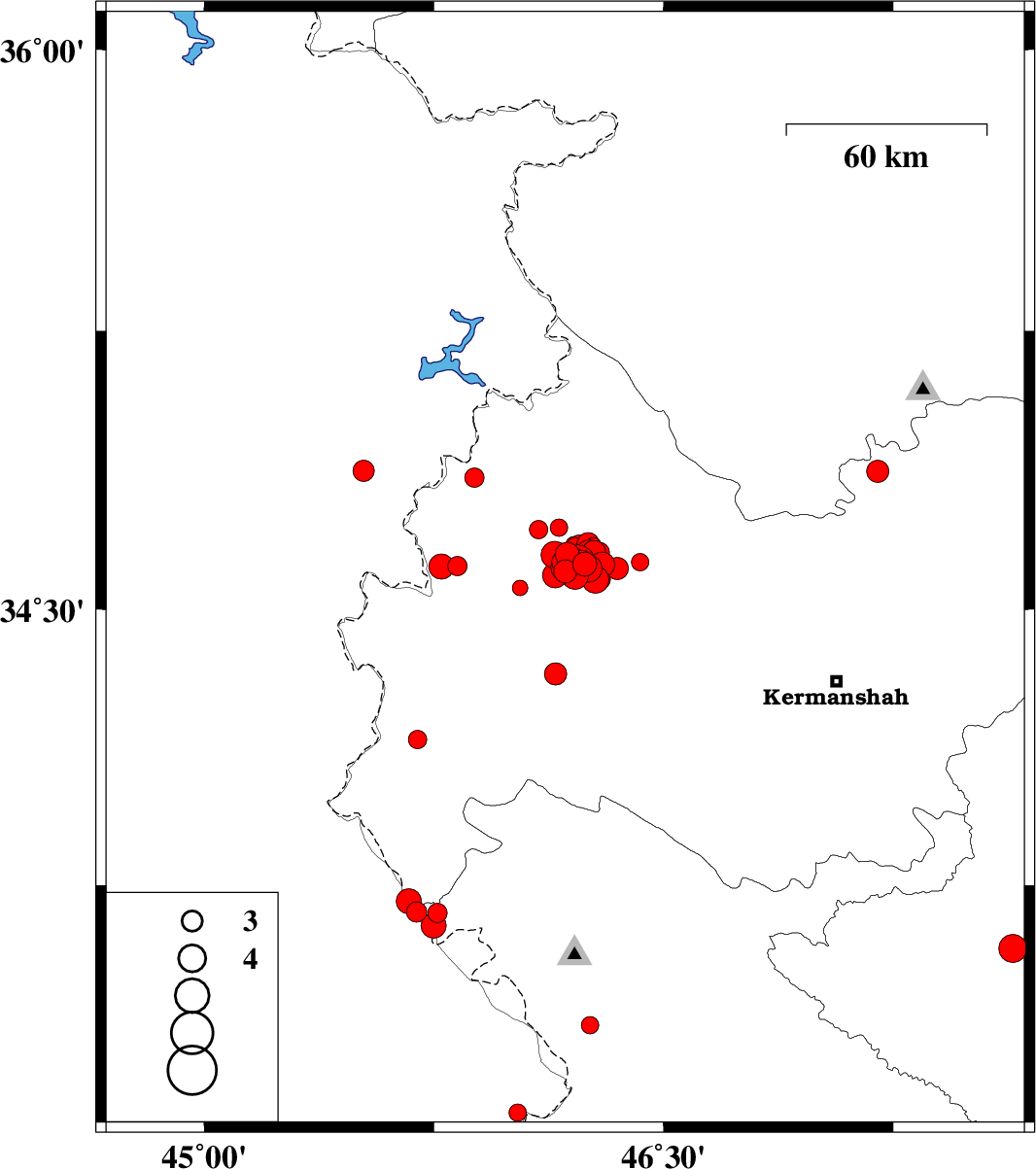 | 2018/08/26 | 18:44:45.3 | 23:14:45.3 | 34.591 | 46.211 | 15 | ML3.9 | Kermanshah Province, 33 km North-East of Sar-e pol-e zahab | ||