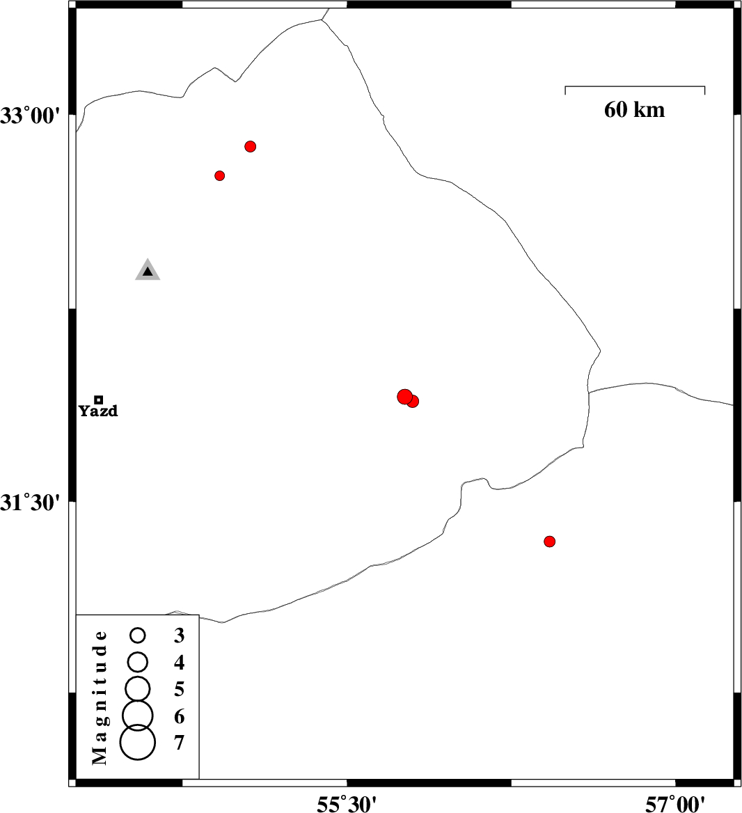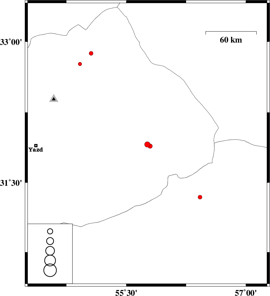 | 2018/07/30 | 08:10:34.7 | 12:40:34.7 | 31.89 | 55.799 | 14 | ML2.5 | Yazd Province, 50 km North-East of Bafq |
