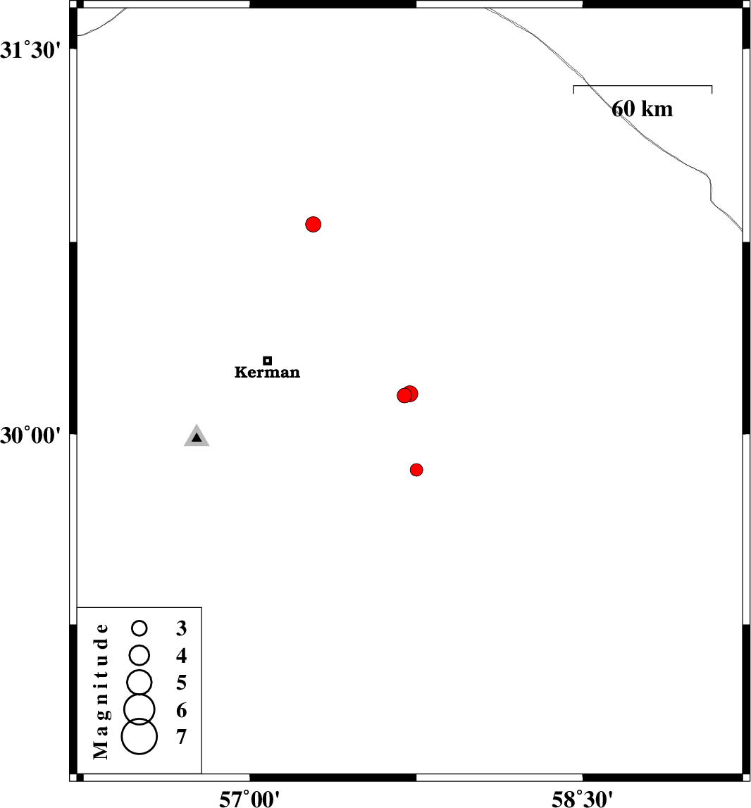 2018/09/02 19:00:44.6 23:30:44.6 30.15157.69714 ML2.9 Kerman Province, 61 km South-East of Kerman