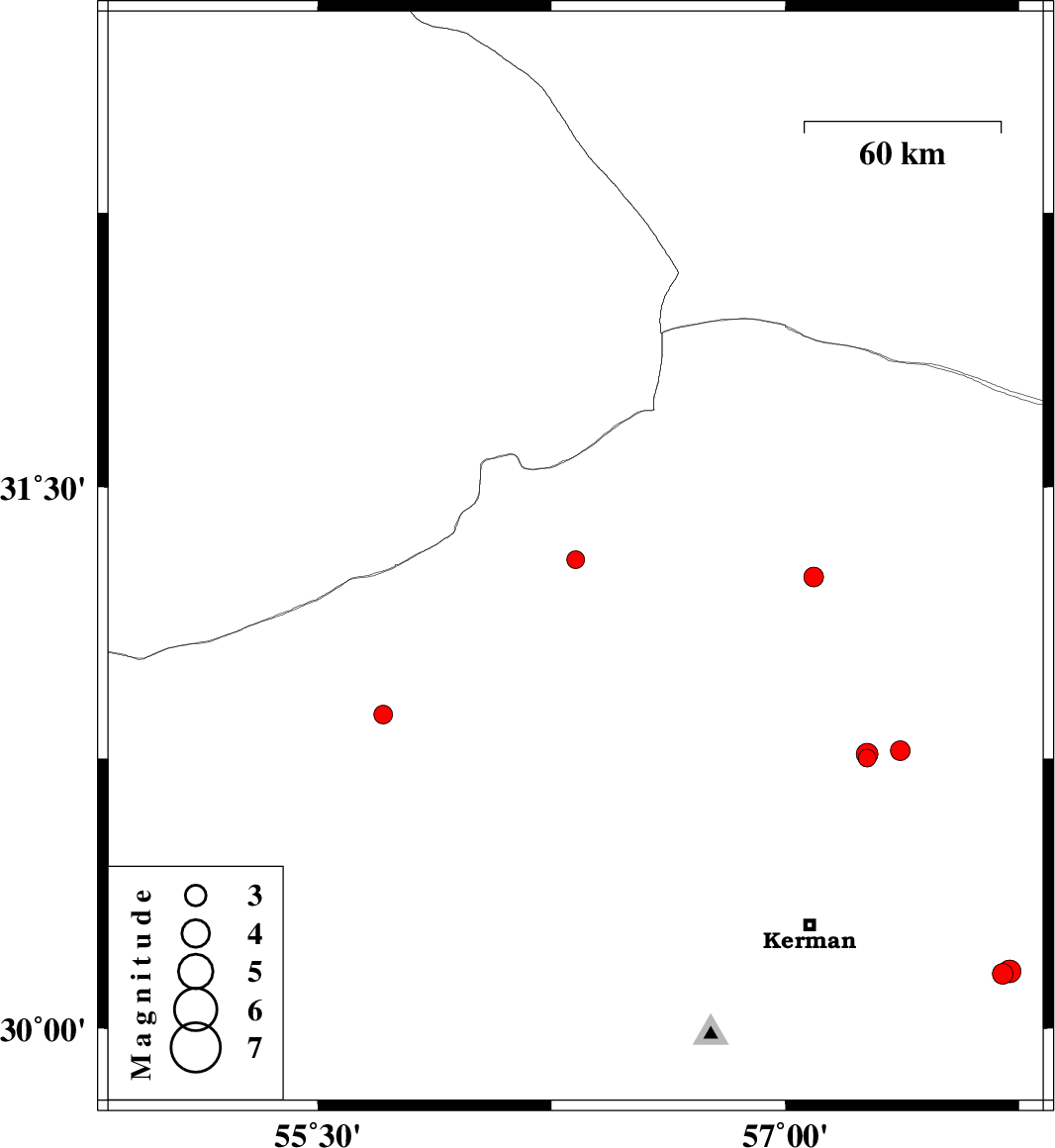 | 2018/09/02 | 18:54:25.8 | 23:24:25.8 | 30.158 | 57.72 | 14 | ML3.3 | Kerman Province, 63 km South-East of Kerman |