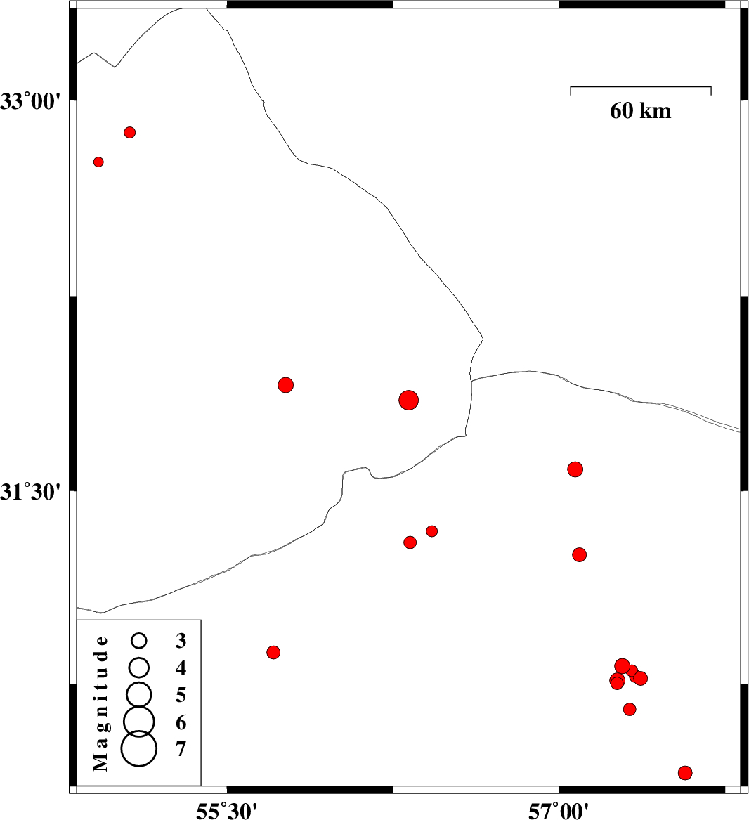 | 2018/09/04 | 17:35:42.3 | 22:05:42.3 | 30.771 | 57.368 | 14 | ML2.8 | Kerman Province, 60 km North-East of Kerman | ||
