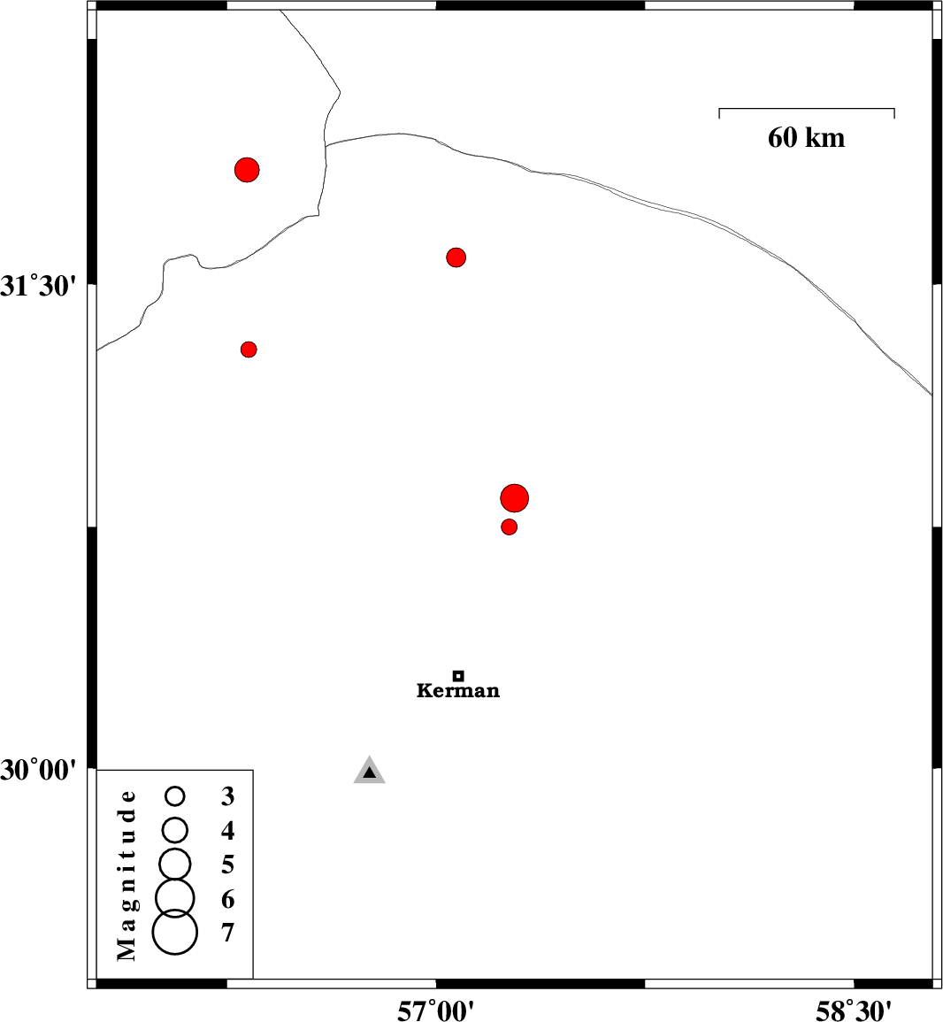 | 2018/09/10 | 14:35:56.2 | 19:05:56.2 | 31.582 | 57.072 | 14 | ML3.1 | Kerman Province, 43 km North-East of Ravar | ||