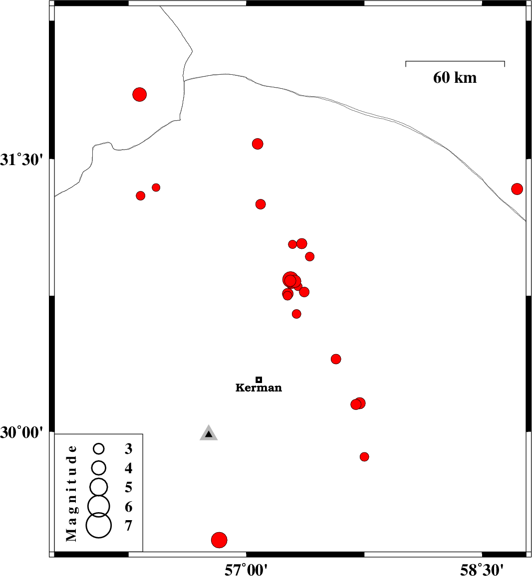 | 2018/09/01 | 00:27:01.1 | 04:57:01.1 | 29.86 | 57.75 | 14 | ML2.5 | Kerman Province, 80 km South-East of Kerman | ||