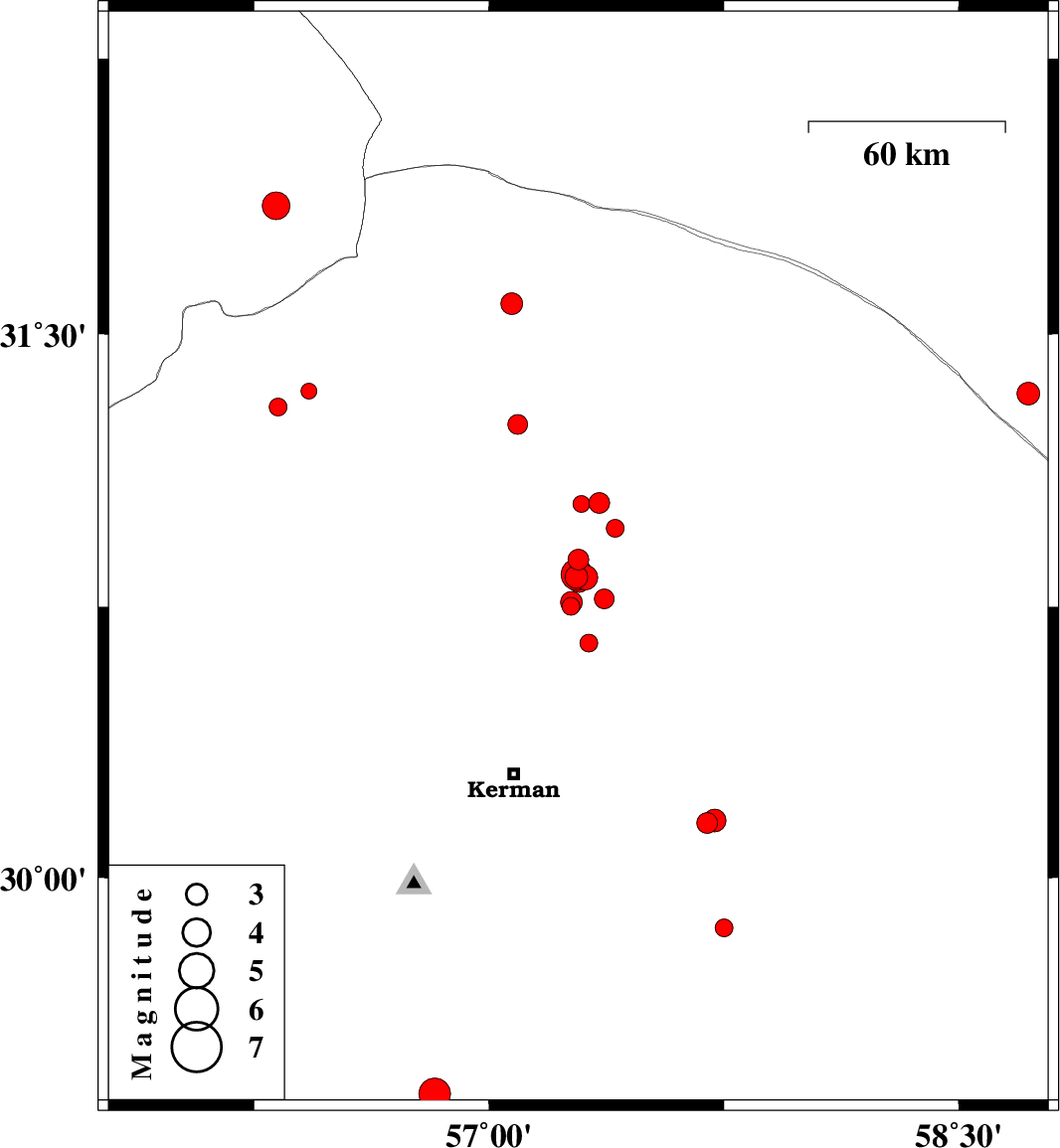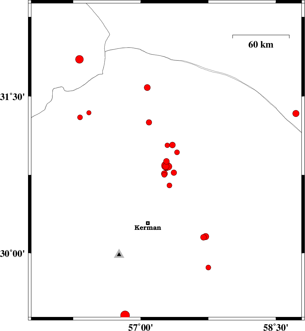 | 2018/09/04 | 17:35:42.3 | 22:05:42.3 | 30.771 | 57.368 | 14 | ML2.8 | Kerman Province, 60 km North-East of Kerman | ||