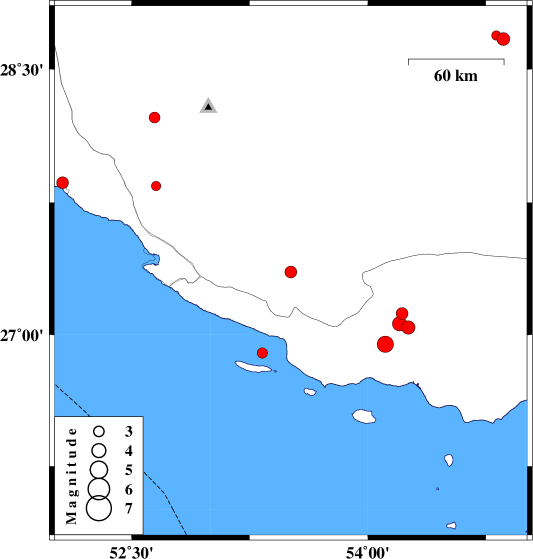 | 2018/09/16 | 02:03:09.1 | 06:33:09.1 | 26.896 | 53.33 | 16 | ML3 | Persian Gulf, 51 km South-East of Lamerd | ||