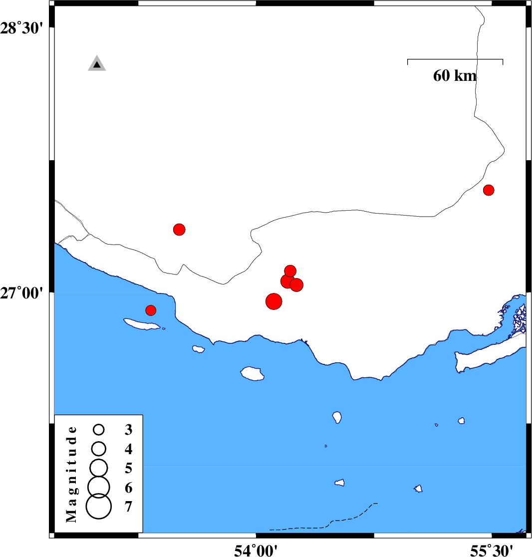 | 2018/09/16 | 02:03:09.1 | 06:33:09.1 | 26.896 | 53.33 | 16 | ML3 | Persian Gulf, 51 km South-East of Lamerd | ||