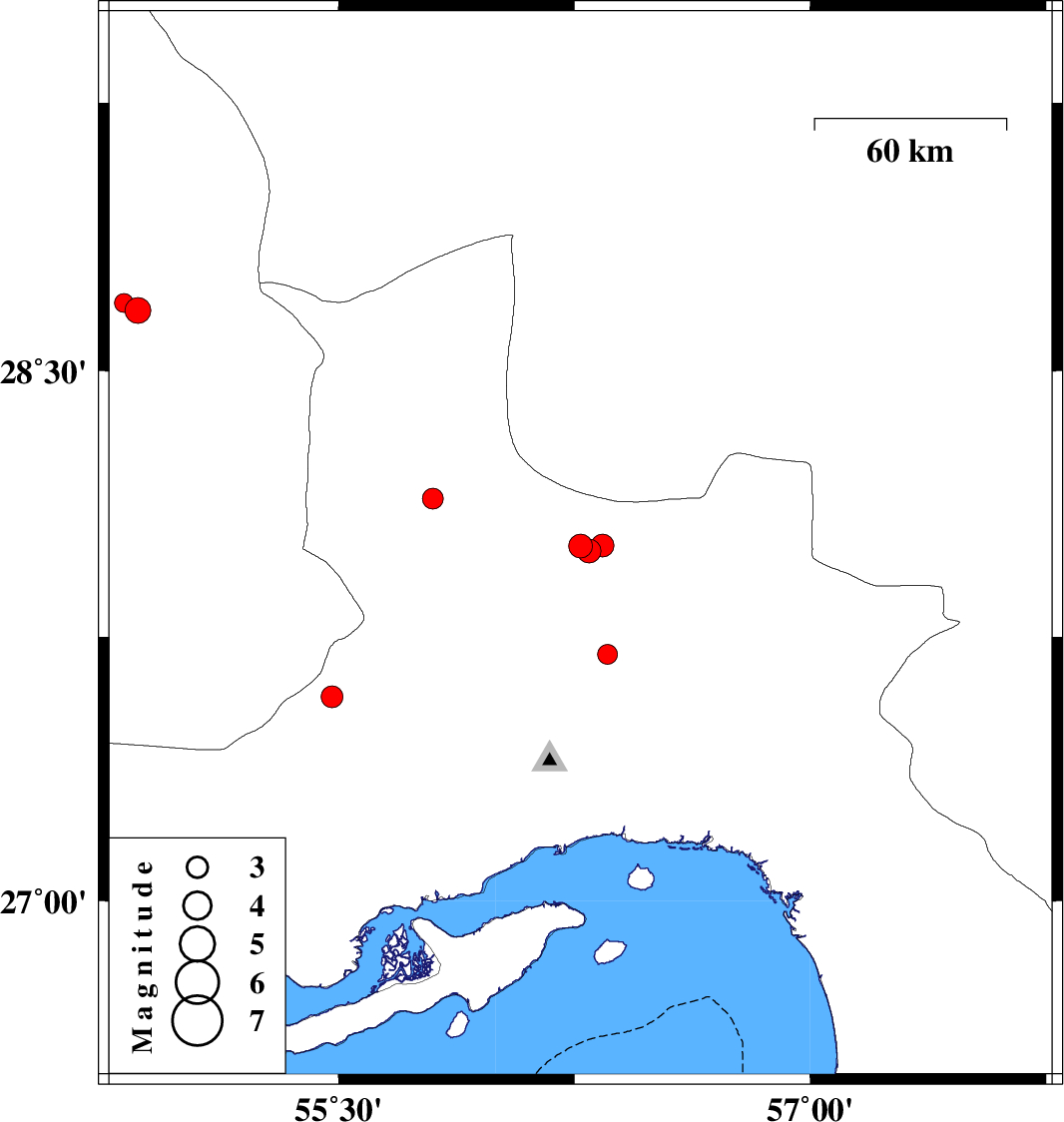 | 2018/09/14 | 07:18:44.3 | 11:48:44.3 | 27.58 | 55.479 | 6 | ML3.1 | Hormozgan Province, 91 km South-West of Hajiabad | ||