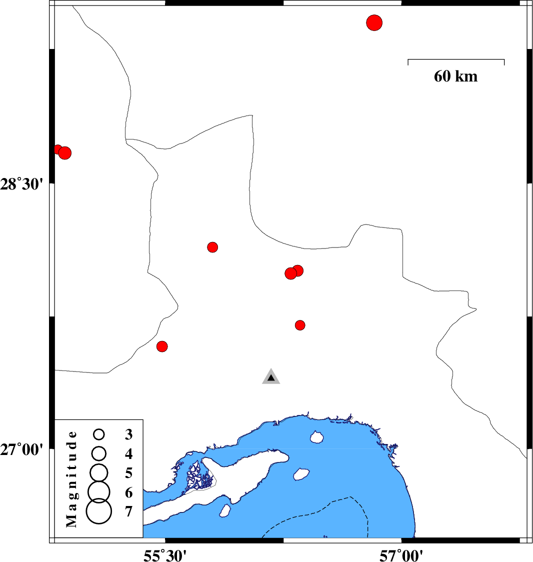 | 2018/09/14 | 07:18:44.3 | 11:48:44.3 | 27.58 | 55.479 | 6 | ML3.1 | Hormozgan Province, 91 km South-West of Hajiabad | ||