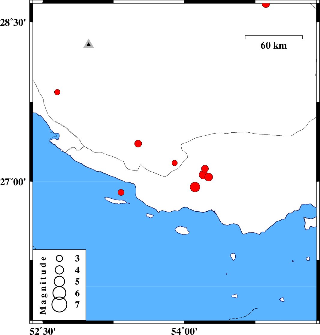 | 2018/09/16 | 02:03:09.1 | 06:33:09.1 | 26.896 | 53.33 | 16 | ML3 | Persian Gulf, 51 km South-East of Lamerd | ||