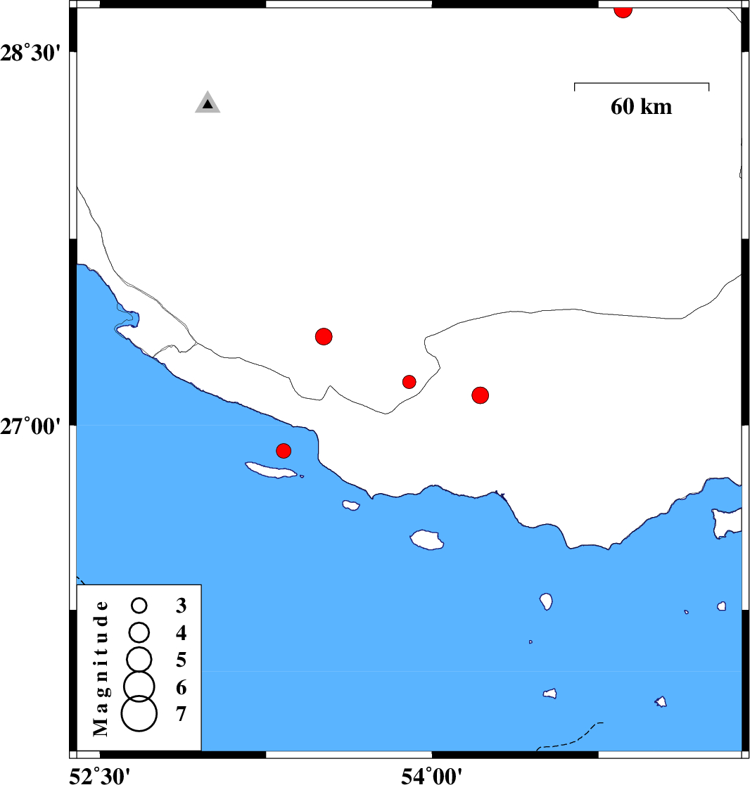 | 2018/09/17 | 19:32:24.5 | 00:02:24.5 | 27.175 | 53.896 | 14 | ML2.7 | Fars Province, 46 km -West of Bastak | ||