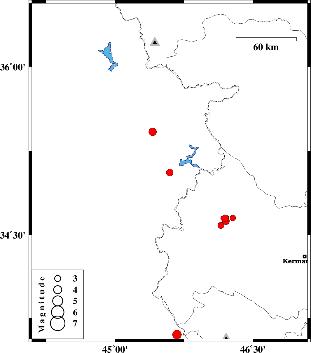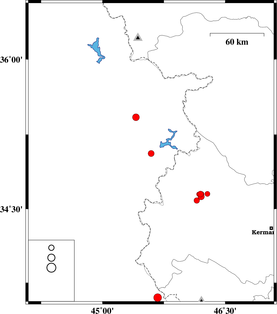 | 2018/09/20 | 12:57:44.7 | 17:27:44.7 | 34.625 | 46.207 | 15 | ML3.5 | Kermanshah Province, 32 km South-West of Javanrud | ||