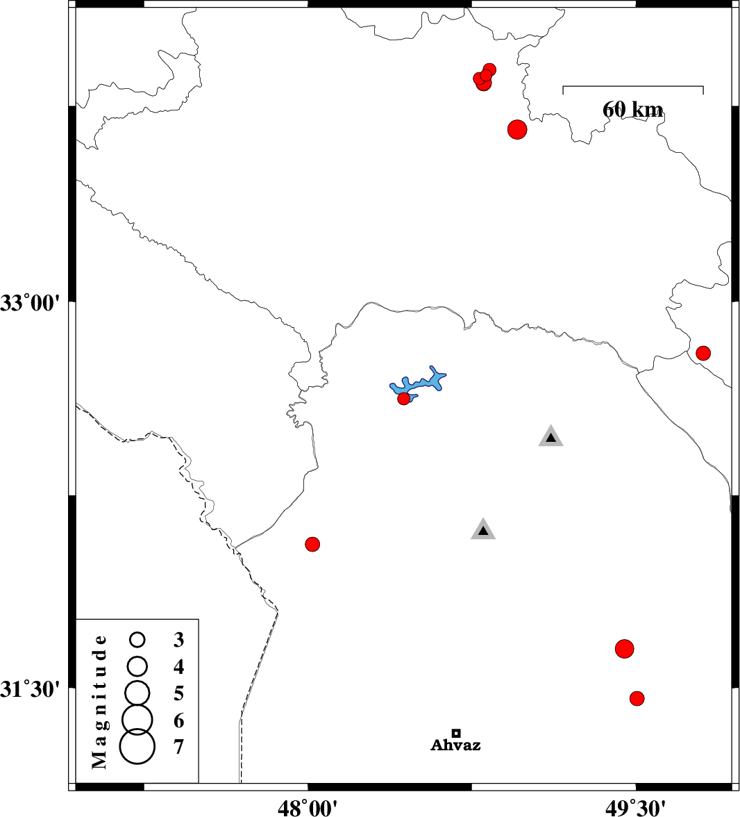 | 2018/09/23 | 08:51:53.1 | 12:21:53.1 | 32.625 | 48.438 | 14 | ML2.5 | Khoozestan Province, 20 km North of Andimeshk | ||