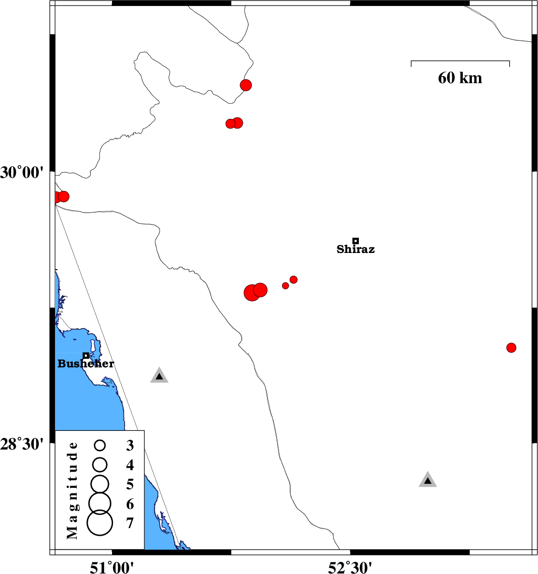 | 2018/09/10 | 12:35:26.3 | 17:05:26.3 | 29.858 | 50.647 | 6 | ML3.2 | Bushehr Province, 34 km North-East of Bandar-e genaveh | ||