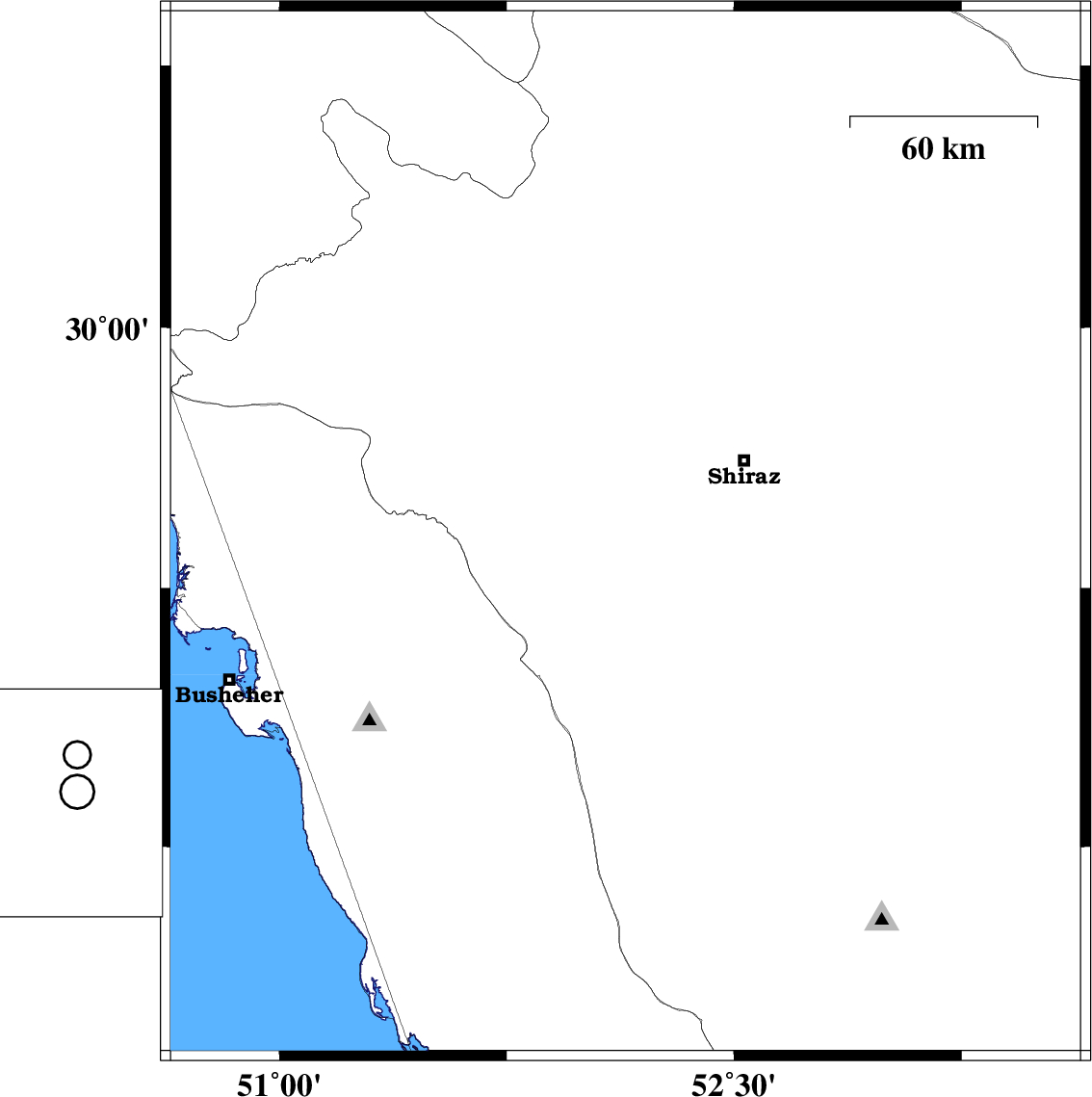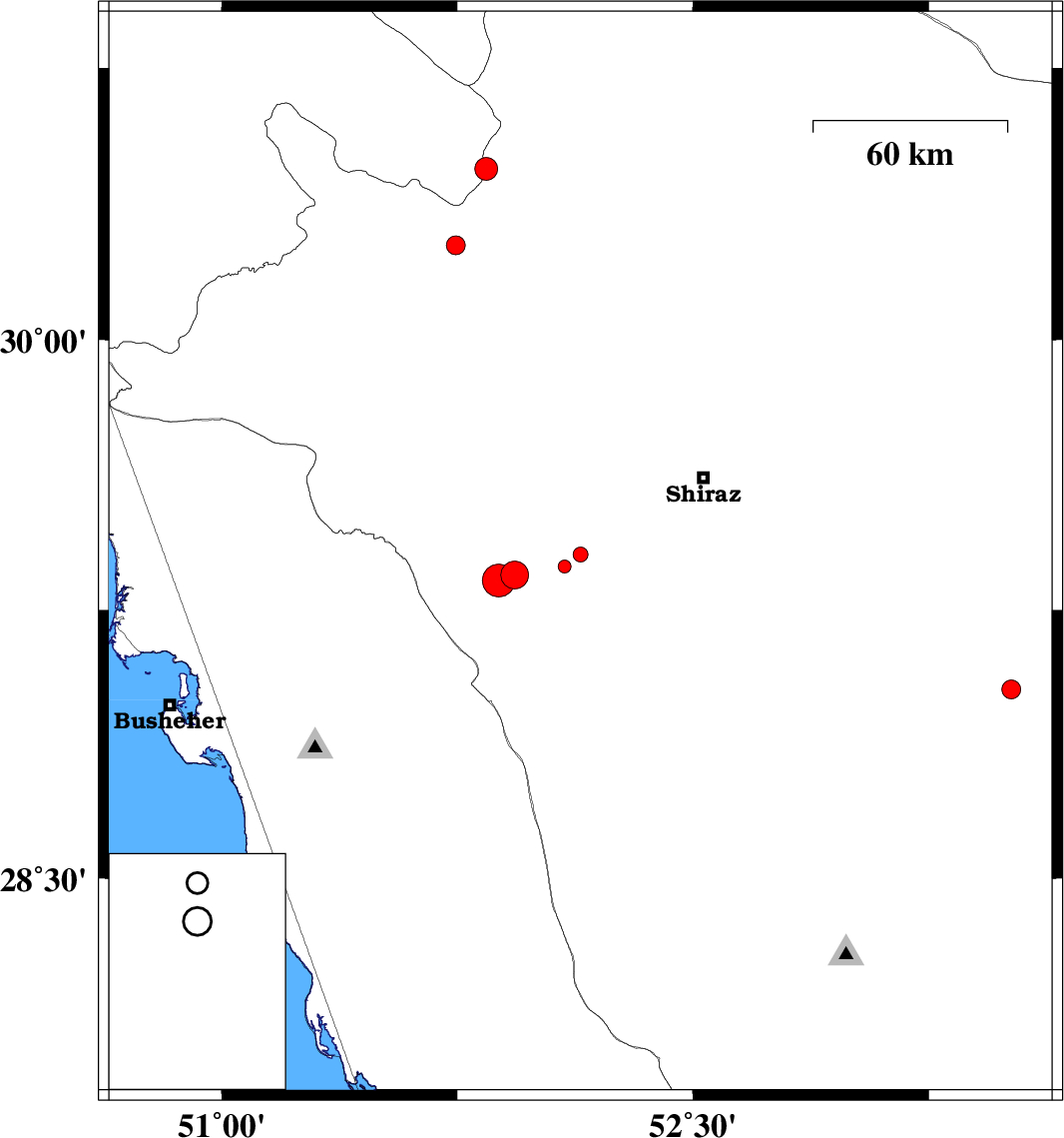 | 2018/09/23 | 06:54:25.2 | 10:24:25.2 | 29.347 | 51.933 | 15 | ML4 | Fars Province, 41 km South-East of Kazerun | ||