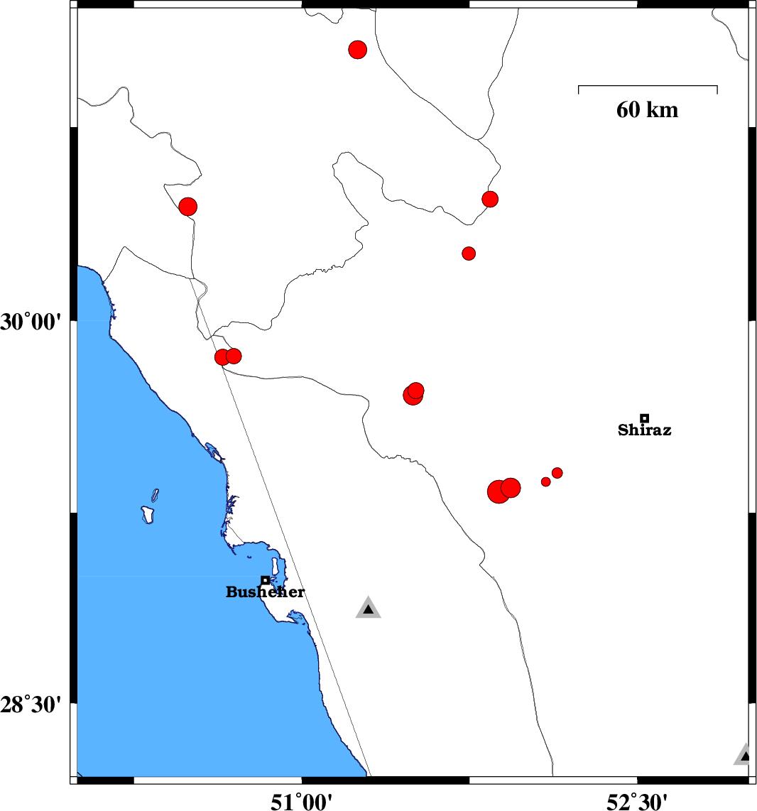 | 2018/09/23 | 05:22:56.6 | 08:52:56.6 | 29.332 | 51.882 | 15 | ML4.7 | Fars Province, 39 km South-East of Kazerun | ||