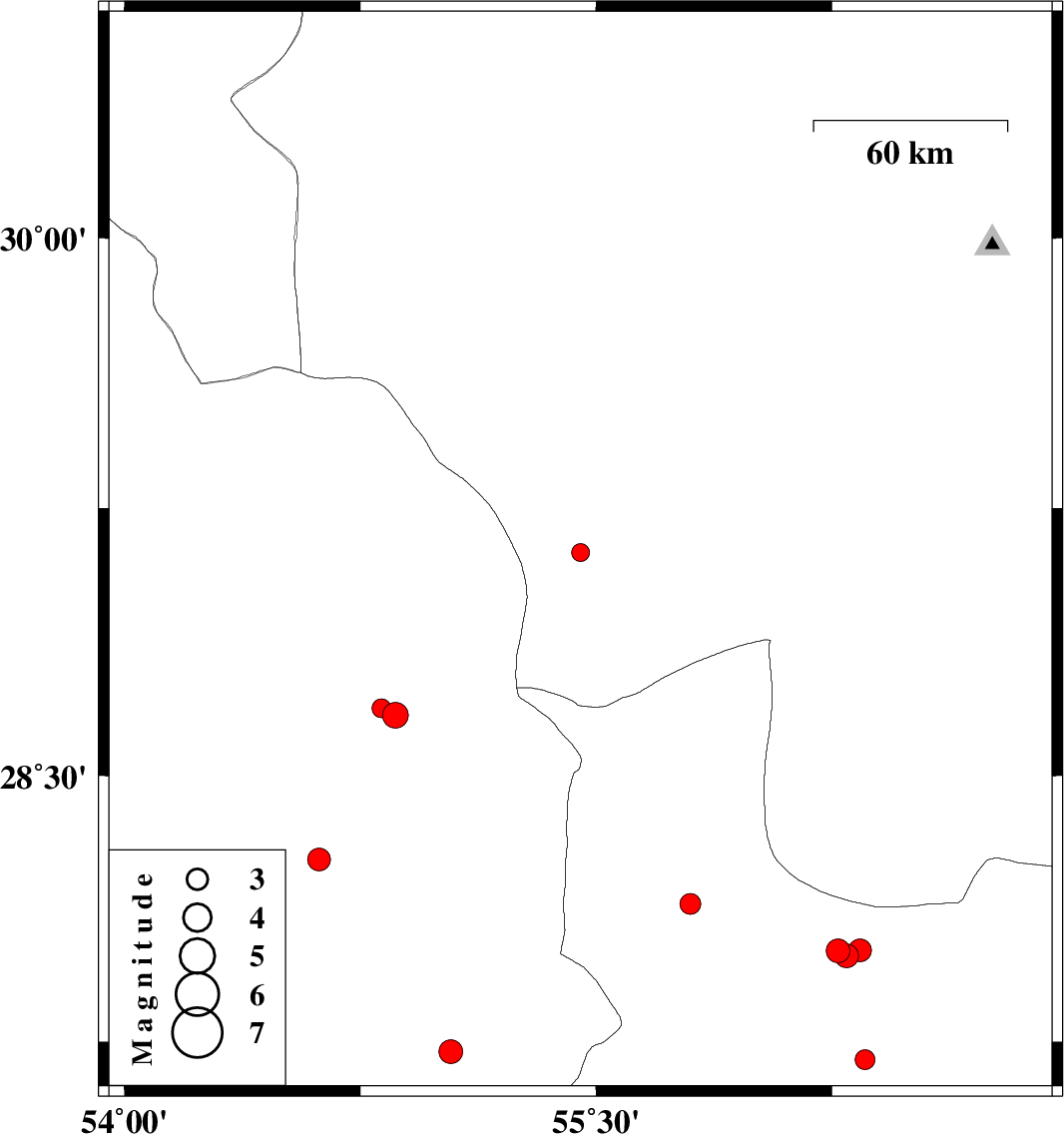 | 2018/09/23 | 03:53:02.5 | 07:23:02.5 | 27.722 | 55.038 | 14 | ML3.4 | Fars Province, 69 km -East of Lar | ||