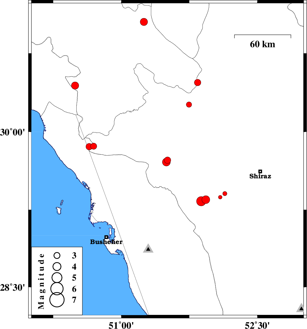 | 2018/09/10 | 12:35:26.3 | 17:05:26.3 | 29.858 | 50.647 | 6 | ML3.2 | Bushehr Province, 34 km North-East of Bandar-e genaveh | ||