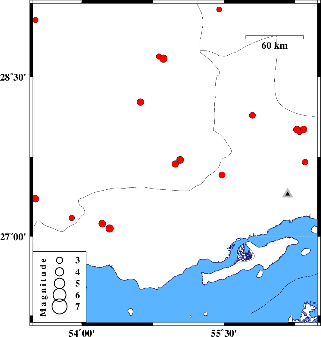 | 2018/09/29 | 09:08:17.2 | 12:38:17.2 | 27.075 | 54.295 | 15 | ML3.6 | Hormozgan Province, 15 km South of Bastak | ||