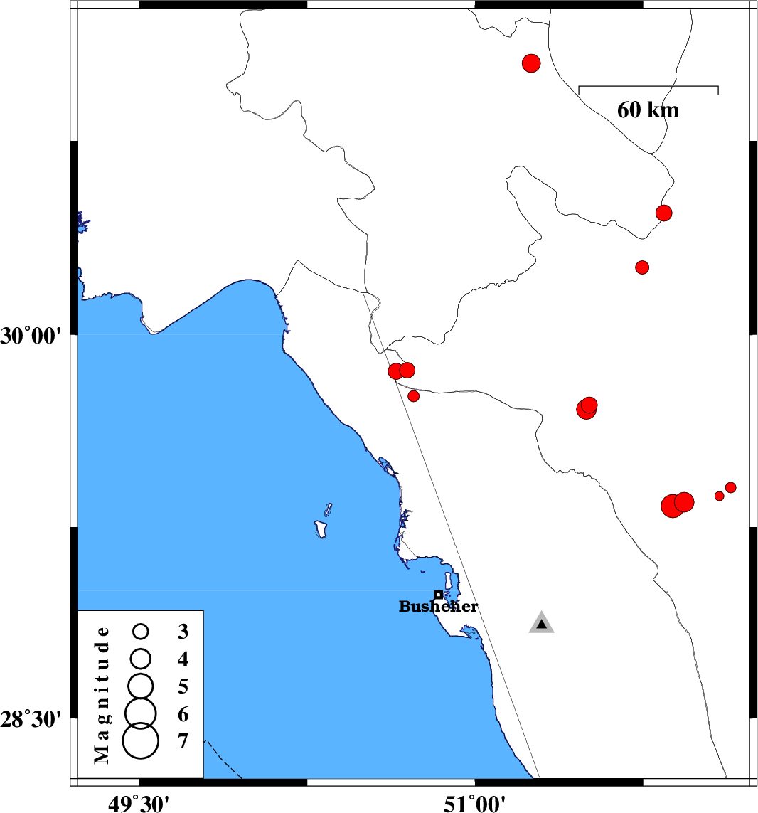 | 2018/09/10 | 12:35:26.3 | 17:05:26.3 | 29.858 | 50.647 | 6 | ML3.2 | Bushehr Province, 34 km North-East of Bandar-e genaveh |