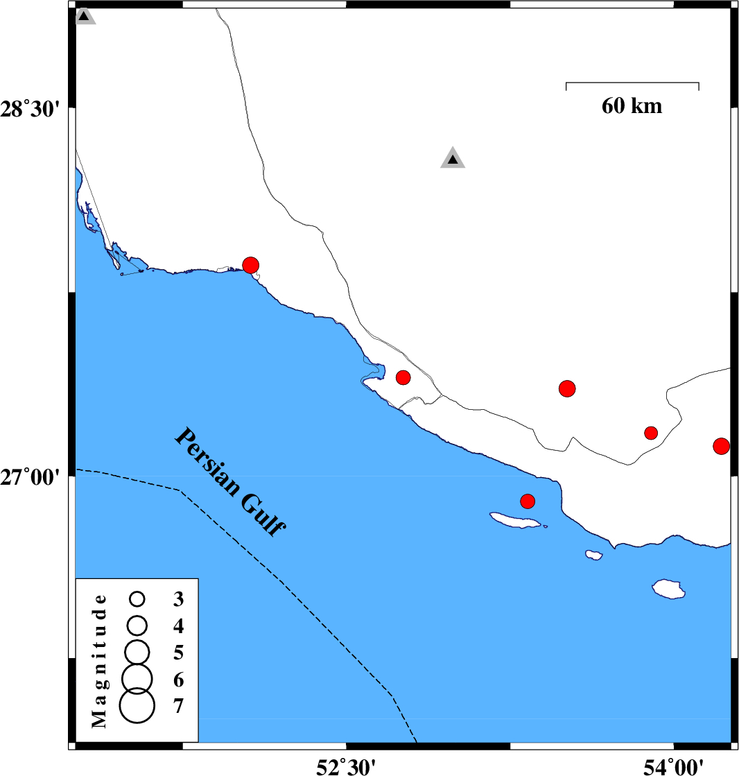 | 2018/09/16 | 02:03:09.1 | 06:33:09.1 | 26.896 | 53.33 | 16 | ML3 | Persian Gulf, 51 km South-East of Lamerd | ||