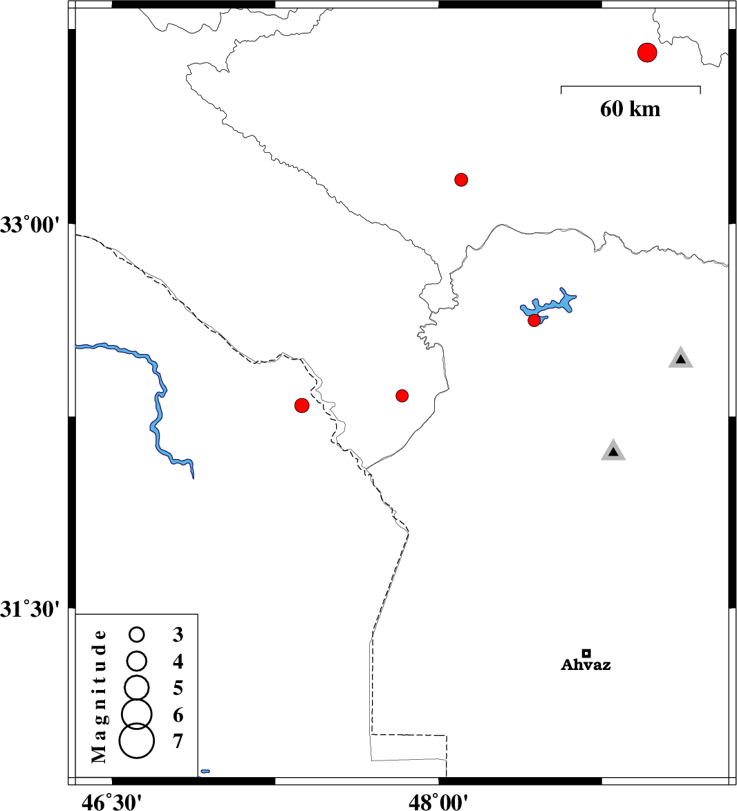 | 2018/09/23 | 08:51:53.1 | 12:21:53.1 | 32.625 | 48.438 | 14 | ML2.5 | Khoozestan Province, 20 km North of Andimeshk | ||