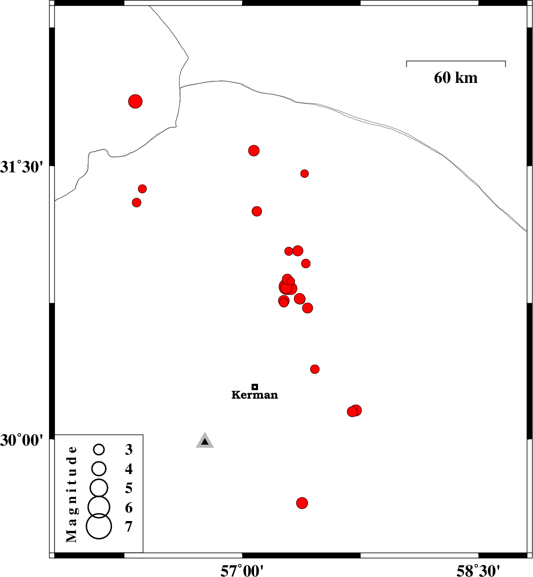 | 2018/09/02 | 18:54:25.8 | 23:24:25.8 | 30.158 | 57.72 | 14 | ML3.3 | Kerman Province, 63 km South-East of Kerman |