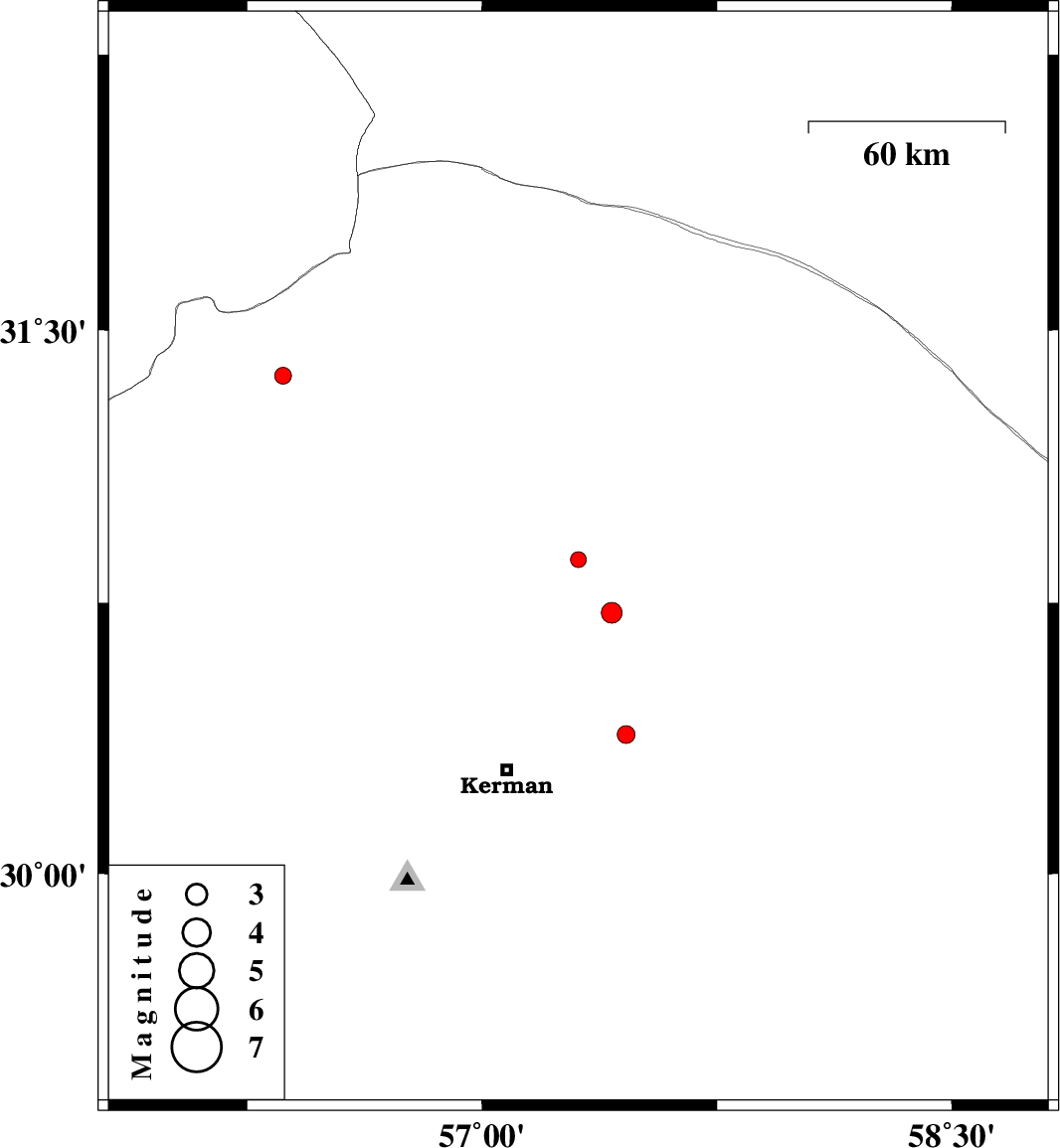 | 2018/09/25 | 00:05:15.8 | 03:35:15.8 | 31.374 | 56.365 | 14 | ML2.4 | Kerman Province, 44 km North-West of Ravar |