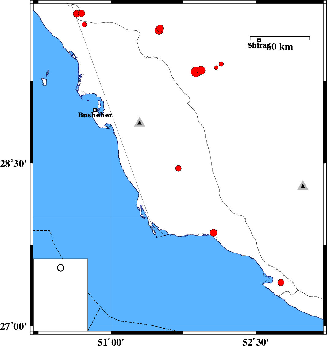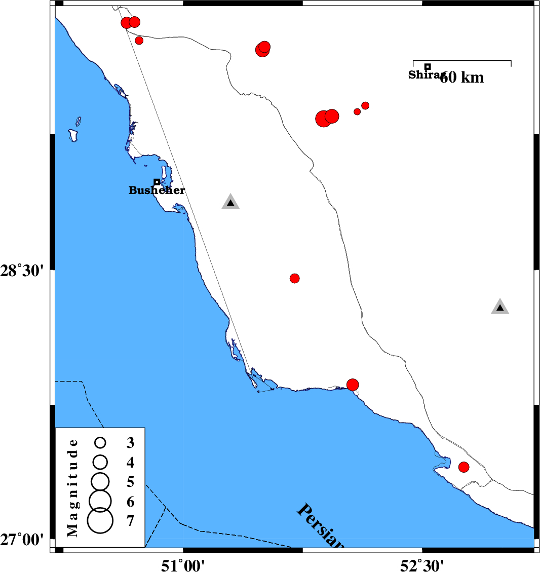 | 2018/10/01 | 08:40:53.9 | 12:10:53.9 | 27.402 | 52.76 | 14 | ML2.9 | Bushehr Province, 20 km South-West of Mehr | ||