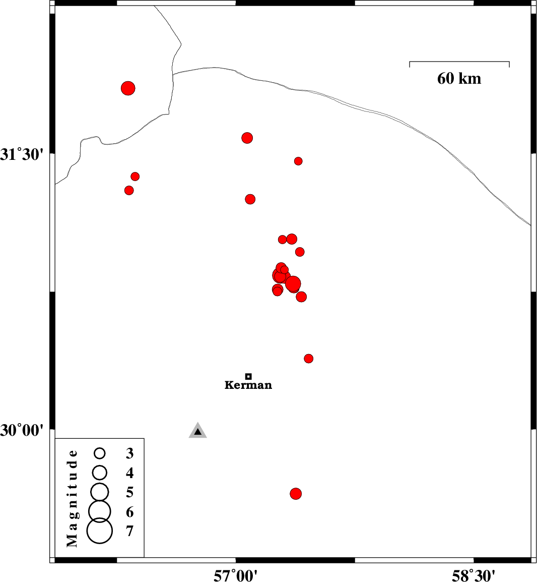 | 2018/09/21 | 00:33:47.3 | 05:03:47.3 | 30.773 | 57.363 | 14 | ML3.1 | Kerman Province, 60 km North-East of Kerman | ||