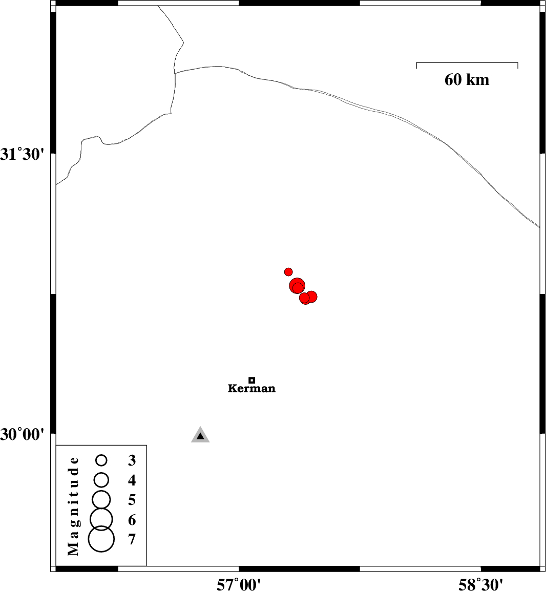 | 2018/10/04 | 03:26:05.2 | 06:56:05.2 | 30.736 | 57.448 | 14 | ML3.2 | Kerman Province, 61 km North-East of Kerman | ||