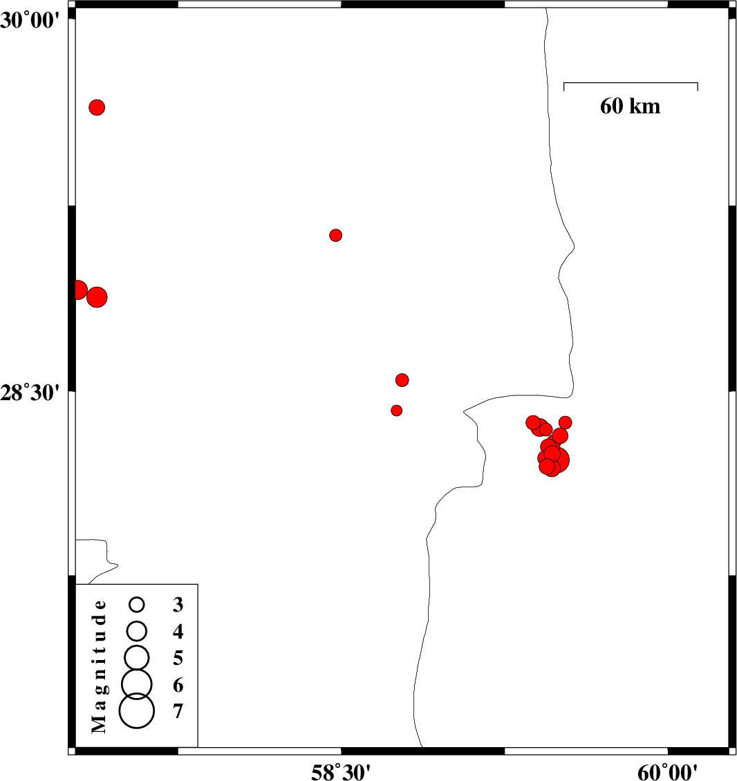 | 2018/09/07 | 06:12:05.3 | 10:42:05.3 | 28.353 | 59.411 | 14 | ML3.6 | Sistan va Baloochestan Province, 133 km South-East of Bam |
