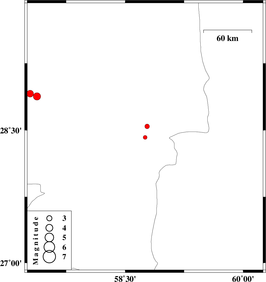 | 2018/09/30 | 13:23:36.6 | 16:53:36.6 | 28.88 | 57.378 | 15 | ML4.2 | Kerman Province, 42 km North-West of Jiroft |