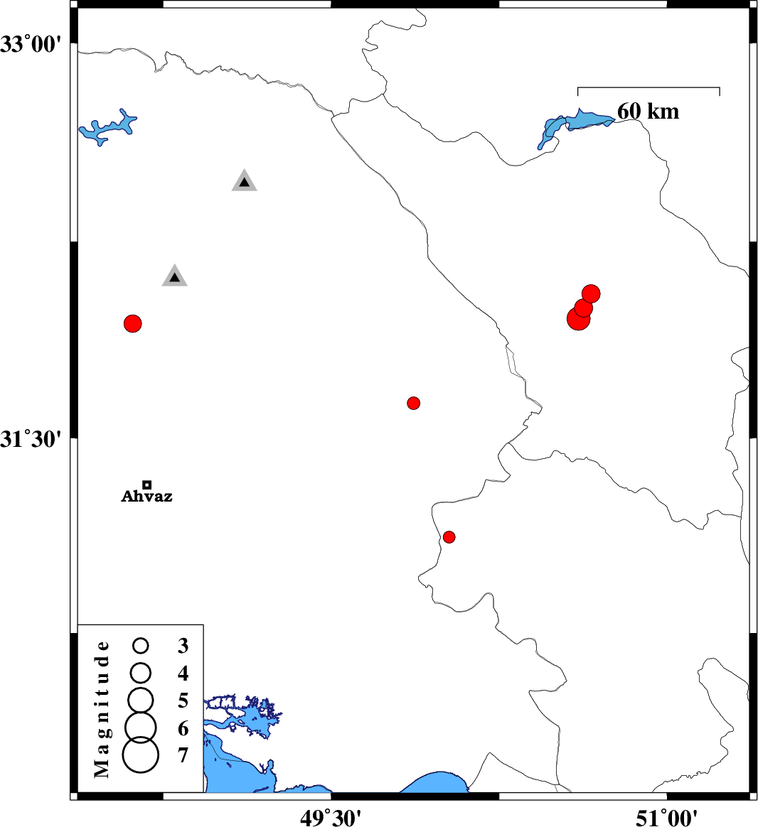 | 2018/10/03 | 09:30:26.7 | 13:00:26.7 | 31.937 | 48.614 | 15 | ML3.5 | Khoozestan Province, 25 km South-West of Shushtar | ||