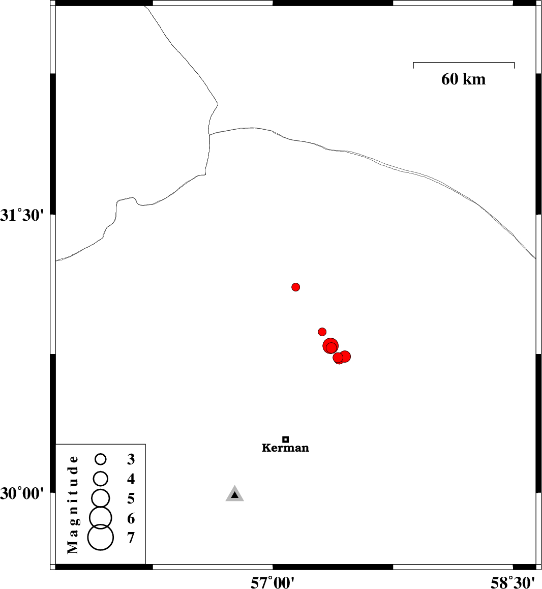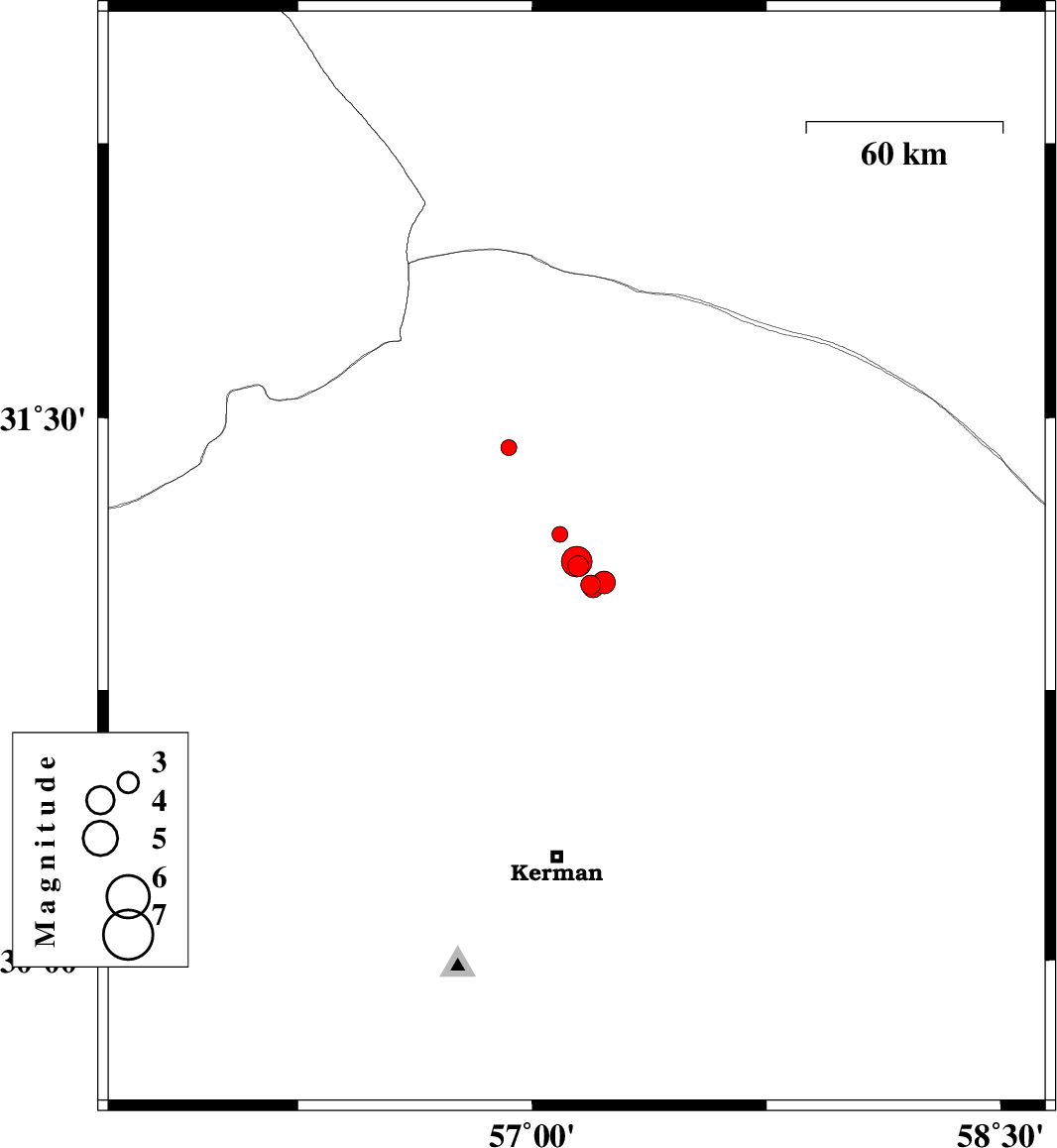 | 2018/10/04 | 03:26:05.2 | 06:56:05.2 | 30.736 | 57.448 | 14 | ML3.2 | Kerman Province, 61 km North-East of Kerman | ||