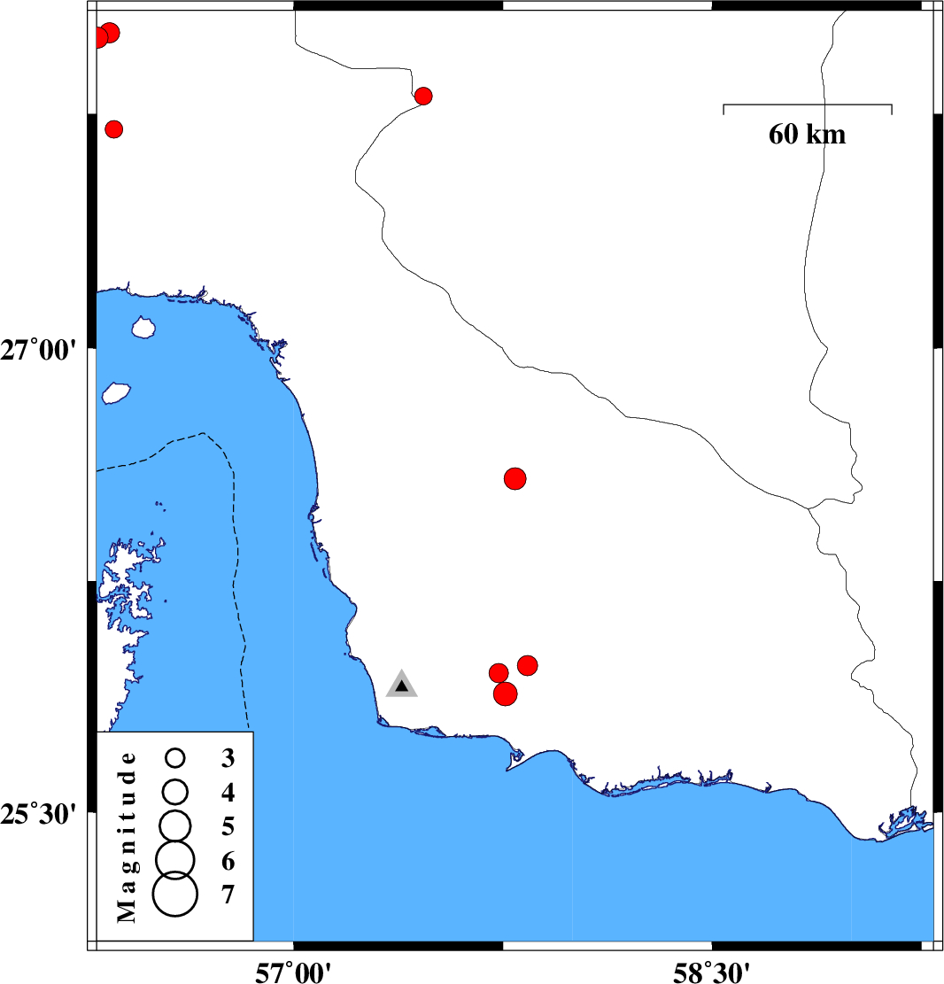 | 2018/10/09 | 03:49:52.1 | 07:19:52.1 | 26.58 | 57.793 | 17 | ML3.5 | Hormozgan Province, 105 km North of Jask | ||
