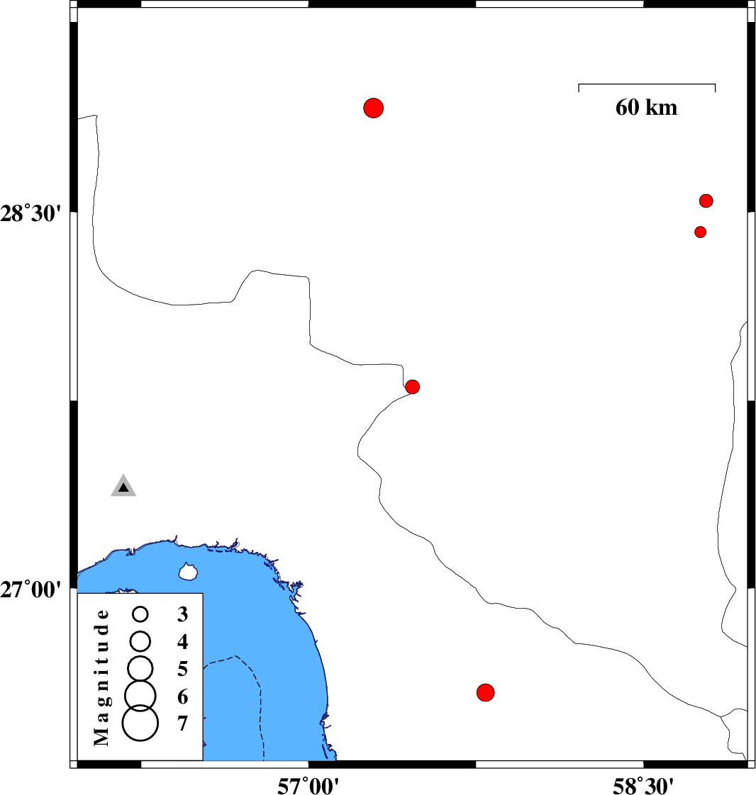 | 2018/10/09 | 16:58:58.7 | 20:28:58.7 | 27.806 | 57.465 | 15 | ML2.8 | Kerman Province, 28 km South-West of Kahnuj | ||