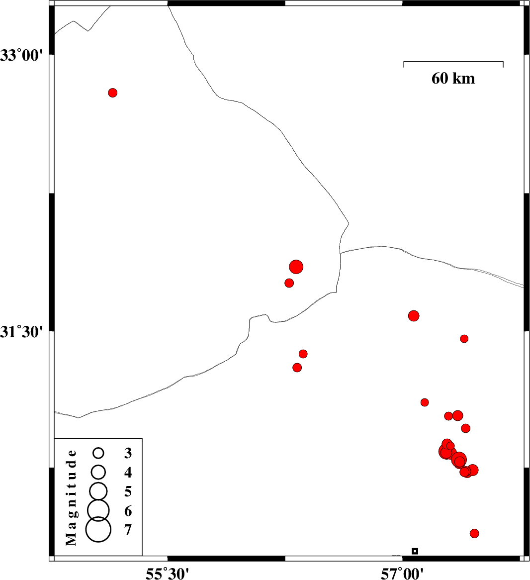 | 2018/10/04 | 03:26:05.2 | 06:56:05.2 | 30.736 | 57.448 | 14 | ML3.2 | Kerman Province, 61 km North-East of Kerman | ||