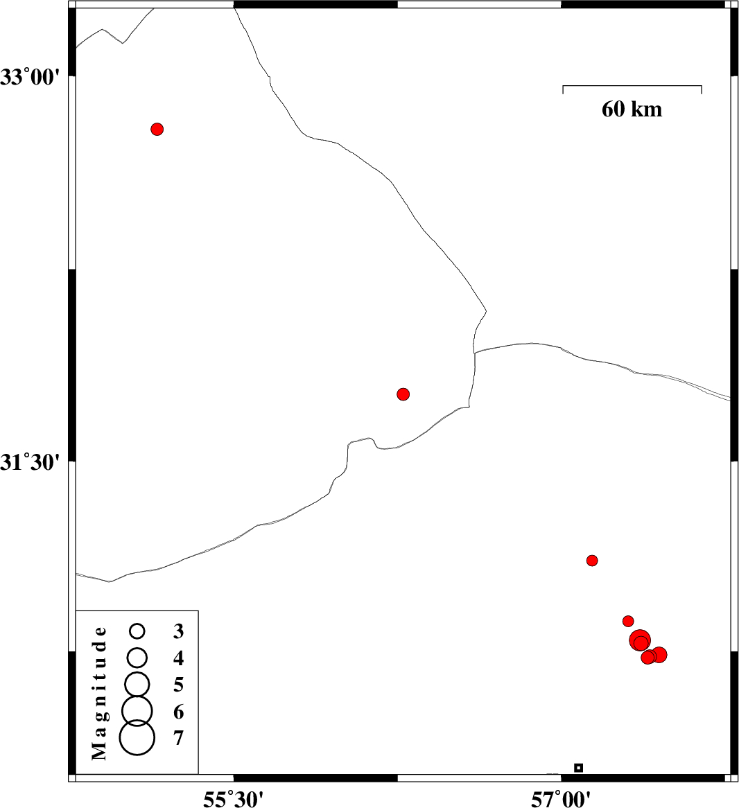 | 2018/10/04 | 03:26:05.2 | 06:56:05.2 | 30.736 | 57.448 | 14 | ML3.2 | Kerman Province, 61 km North-East of Kerman | ||