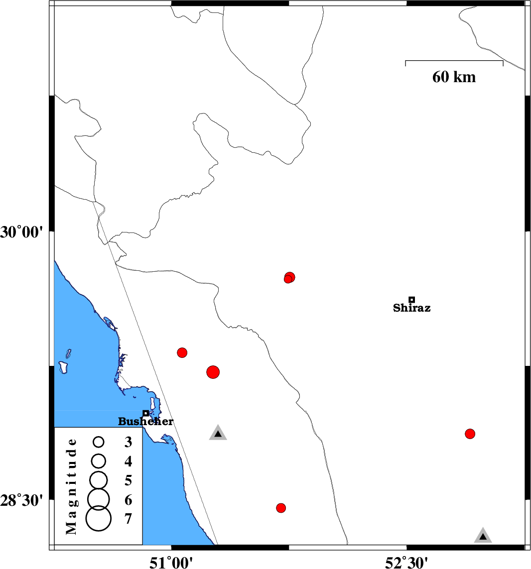 | 2018/10/06 | 01:23:57.1 | 04:53:57.1 | 29.215 | 51.265 | 15 | ML3.7 | Bushehr Province, 8 km of Borazjan | ||