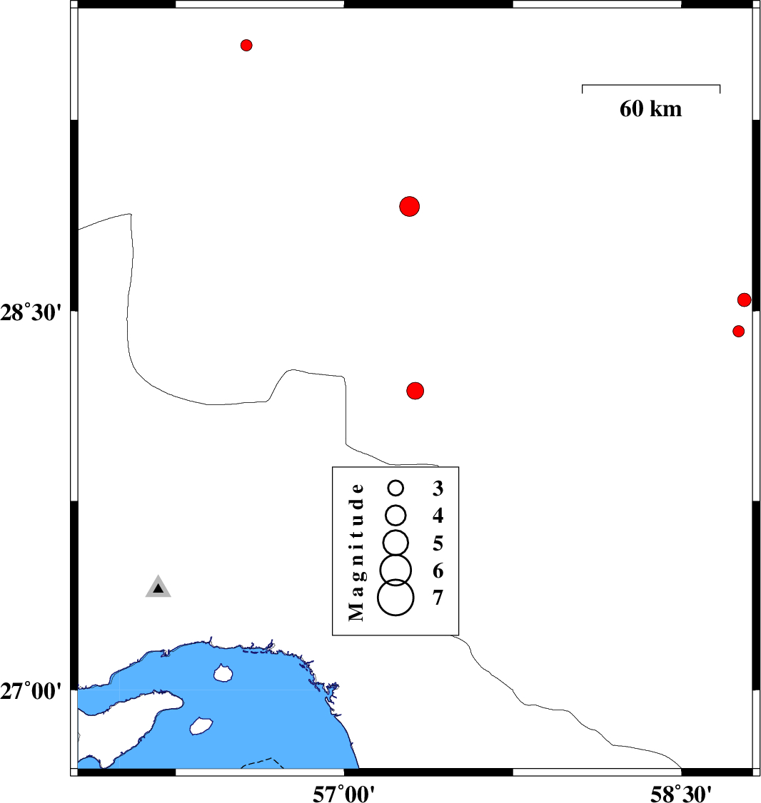| 2018/10/04 | 17:26:12.5 | 20:56:12.5 | 28.91 | 57.29 | 15 | ML3.9 | Kerman Province, 51 km North-West of Jiroft |