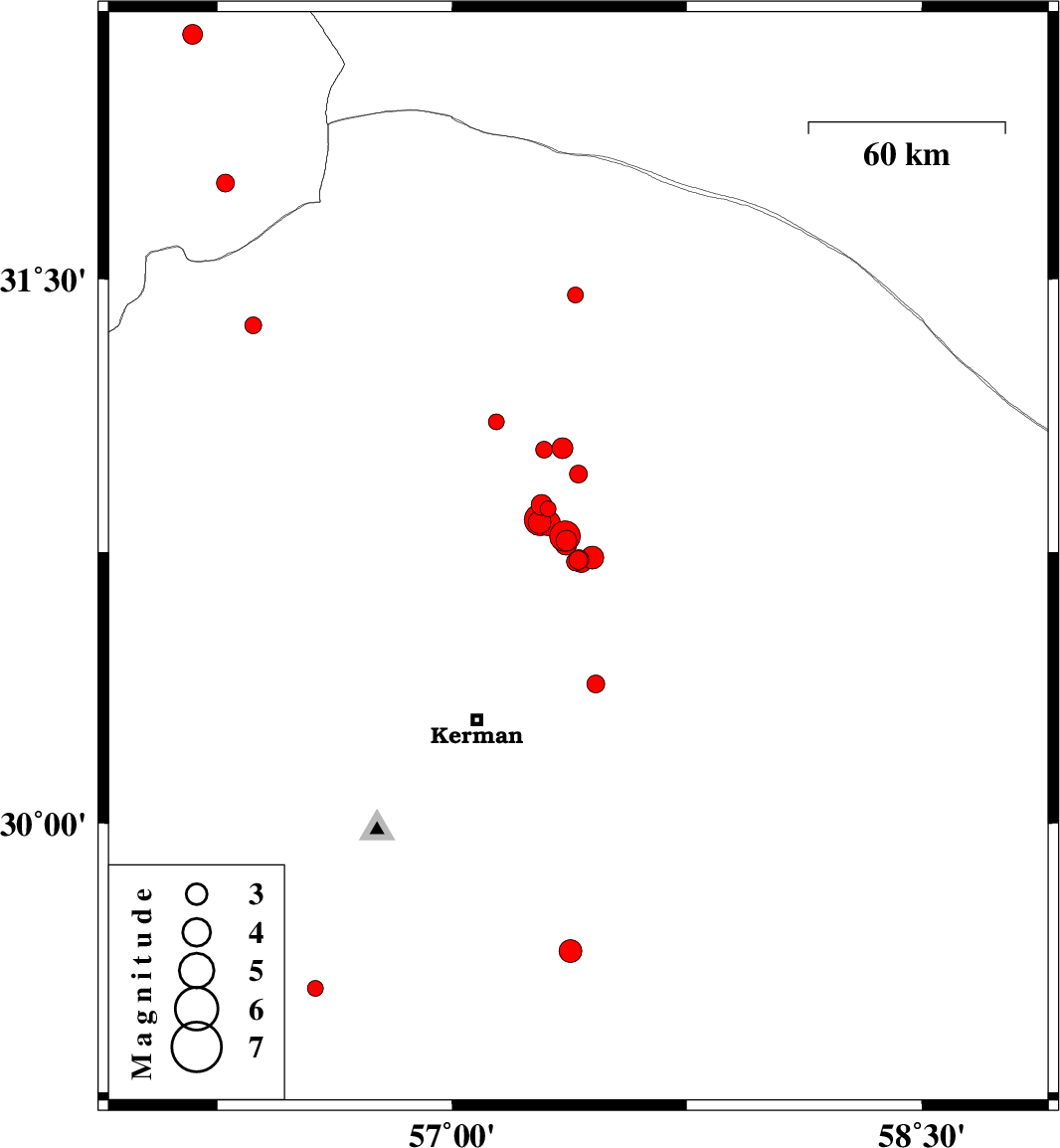 | 2018/10/04 | 03:26:05.2 | 06:56:05.2 | 30.736 | 57.448 | 14 | ML3.2 | Kerman Province, 61 km North-East of Kerman | ||