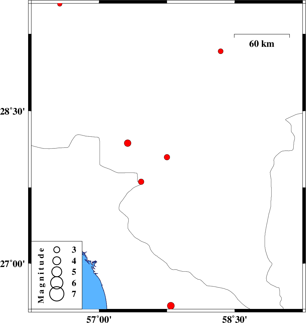 | 2018/10/09 | 16:58:58.7 | 20:28:58.7 | 27.806 | 57.465 | 15 | ML2.8 | Kerman Province, 28 km South-West of Kahnuj | ||