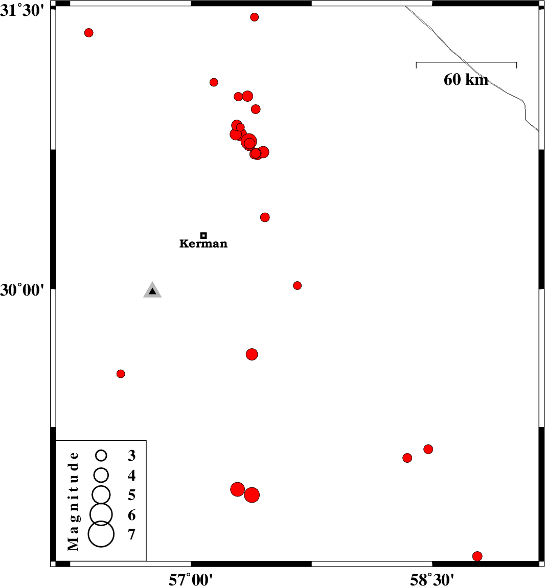2018/09/25 | 22:37:00.2 | 02:07:00.2 | 30.386 | 57.459 | 14 | ML:2.6 | Kerman Province, 38 km -East of Kerman | ||