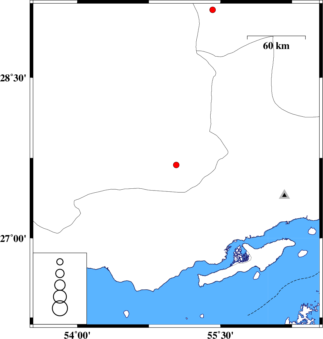| 2018/10/15 | 15:09:06.2 | 18:39:06.2 | 27.686 | 55.037 | 14 | ML2.8 | Fars Province, 69 km -East of Lar | ||