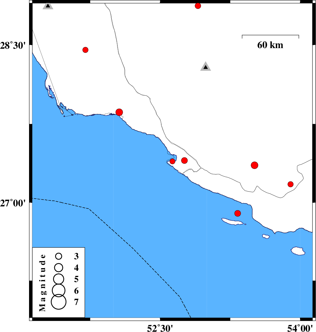| 2018/09/16 | 01:07:28.0 | 05:37:28.0 | 27.861 | 52.062 | 14 | ML3.4 | Bushehr Province, 4 km of Bandar-e kangan |