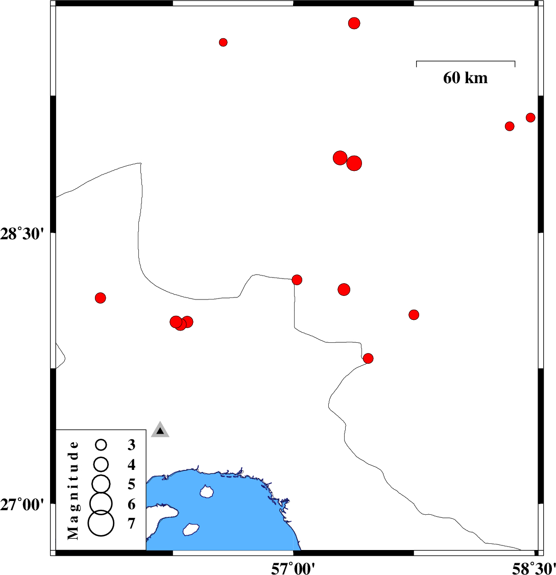 | 2018/10/09 | 16:58:58.7 | 20:28:58.7 | 27.806 | 57.465 | 15 | ML2.8 | Kerman Province, 28 km South-West of Kahnuj | ||