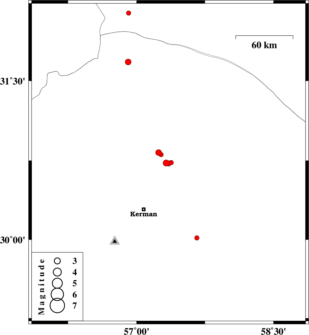 | 2018/10/14 | 14:21:12.2 | 17:51:12.2 | 30.017 | 57.661 | 14 | ML2.3 | Kerman Province, 64 km South-East of Kerman |