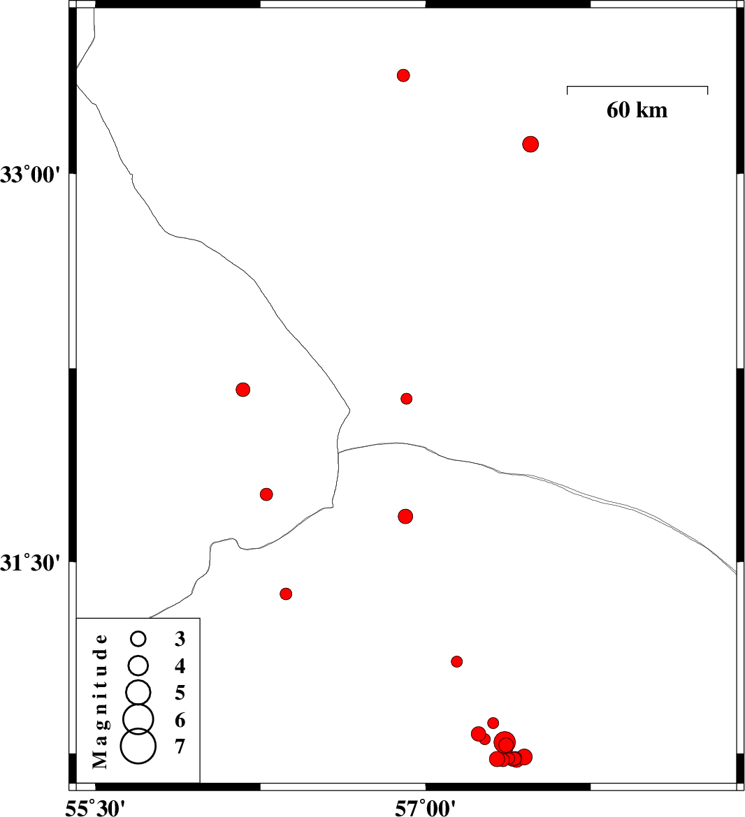 | 2018/10/04 | 03:26:05.2 | 06:56:05.2 | 30.736 | 57.448 | 14 | ML3.2 | Kerman Province, 61 km North-East of Kerman | ||